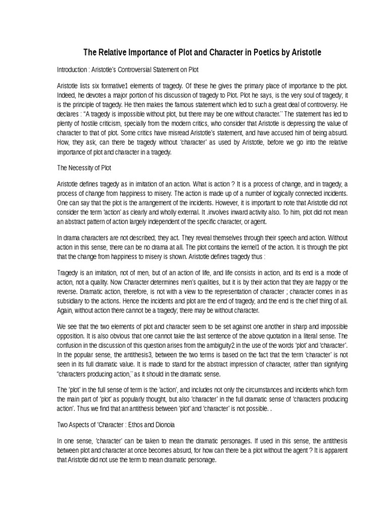 The Relative Importance Of Plot And Character In Poetics By Aristotl1 Pdf Plot Narrative Tragedy